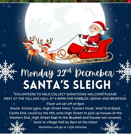 Sleigh starts at Maxey village hall at 5pm. Drinks and nibbles in Village hall beforehand